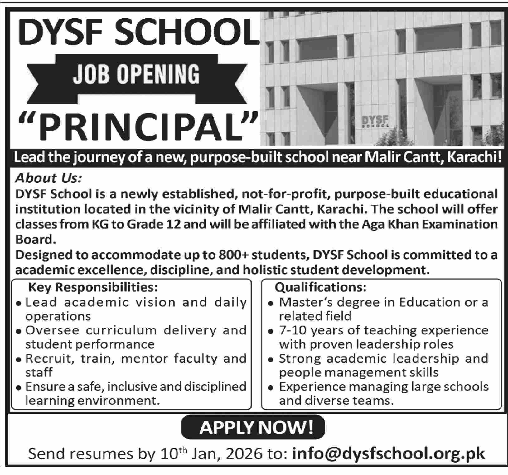 School Profile (as per ad): DYSF School is a newly established, not-for-profit, purpose-built educational institution located in the vicinity of Malir Cantt, Karachi. The school will offer classes from KG to Grade 12 and will be affiliated with the Aga Khan Examination Board. Designed to accommodate up to 800+ students, the school is committed to academic excellence, discipline, and holistic student development.